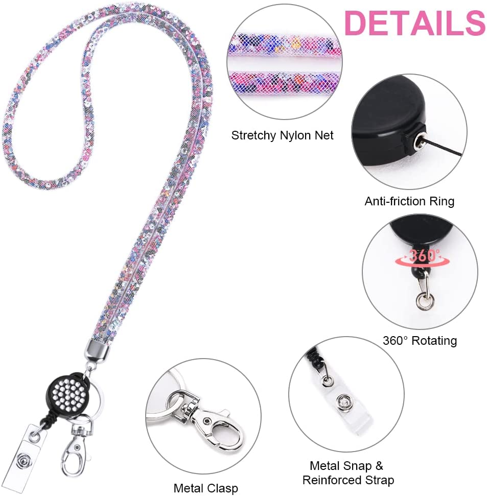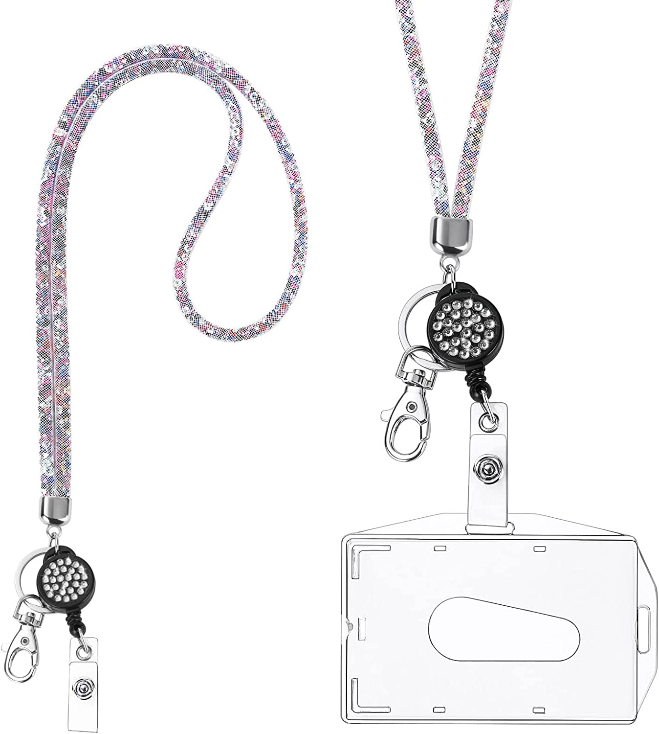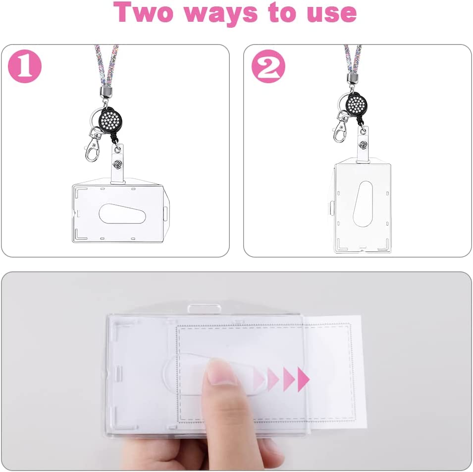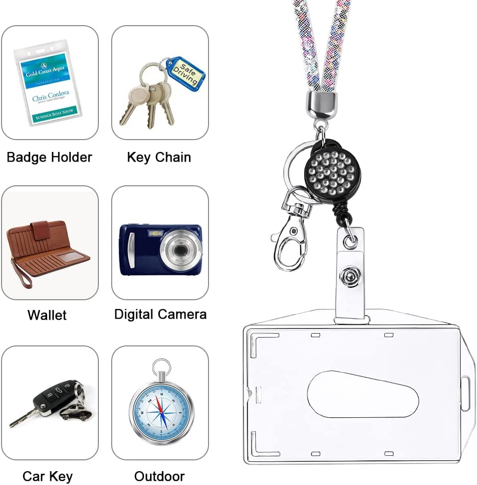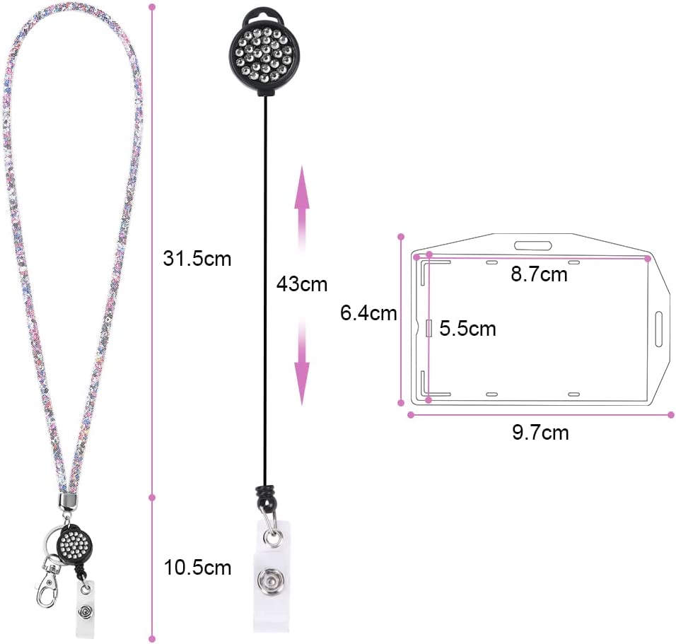 About this item 【Perfect Combination】This one includes a retractable rhinestone lanyard and card holder, both a card holder and a keychain ring, you can wear both the card and the pendant key at the same time. 【Unique Design】The rhinestone lanyard is shiny and attractive, the card sleeve is horizontal and vertical design, you can choose the right direction to wear, the card sleeve can hold 2 credit cards, suitable for ID card holder, work card holder, smartphone, camera, music player , keys, etc. 【Suitable size】 The total length of the rhinestone lanyard is about 42cm, the easy-to-pull buckle can be extended by 43cm, and the inner diameter of the card sleeve is 8.7*5.5cm, which is highly practical. 【Durable Material】This lanyard is made of high-quality material, durable and lightweight, and easy to wear, the ID card holder is made of PS transparent material to prevent the card from being bent or broken. 【Practical Accessories】These crystal lanyard shoulder straps are practical accessories in everyday life, suitable for school events, parties, work and meetings, and are also great gifts for women and girls.