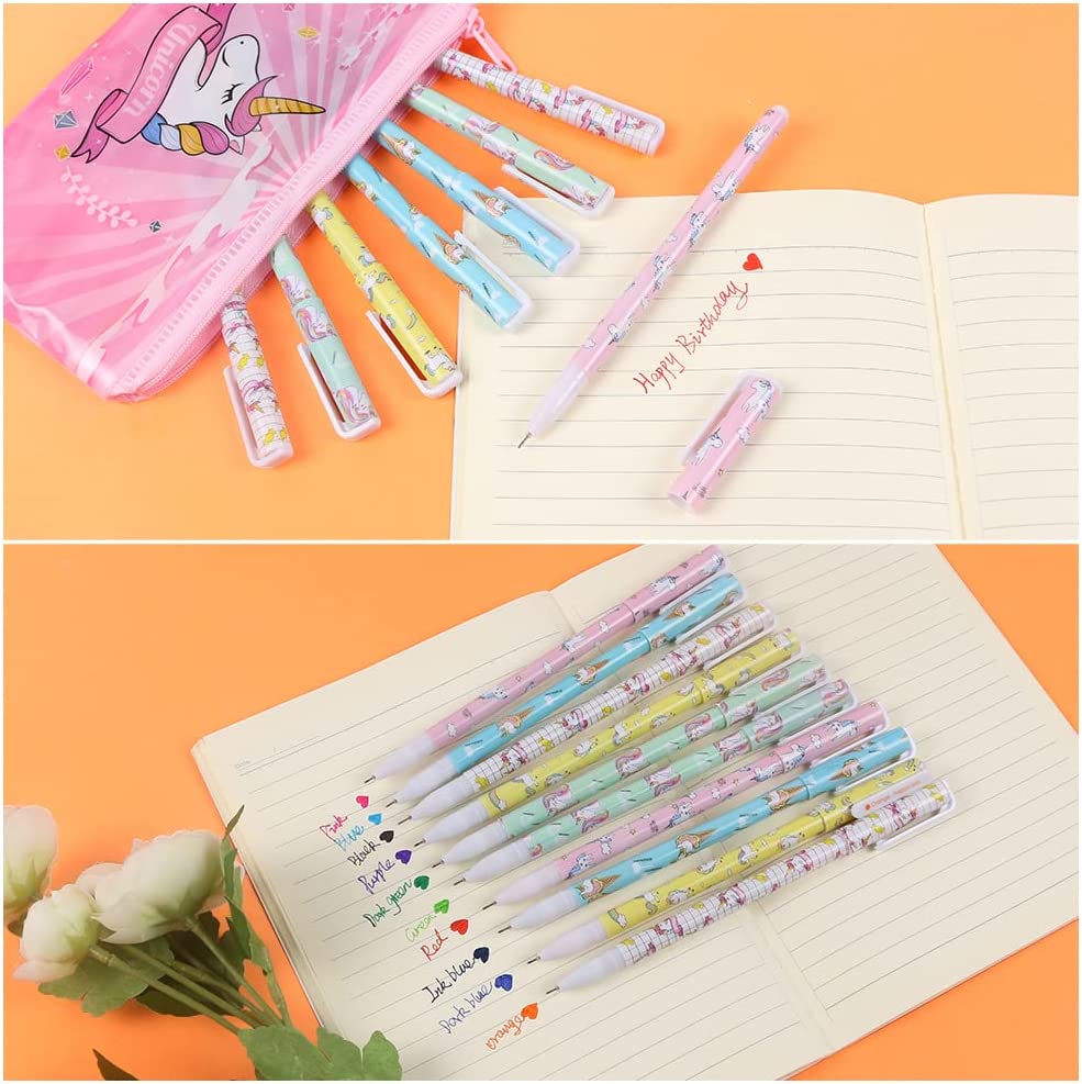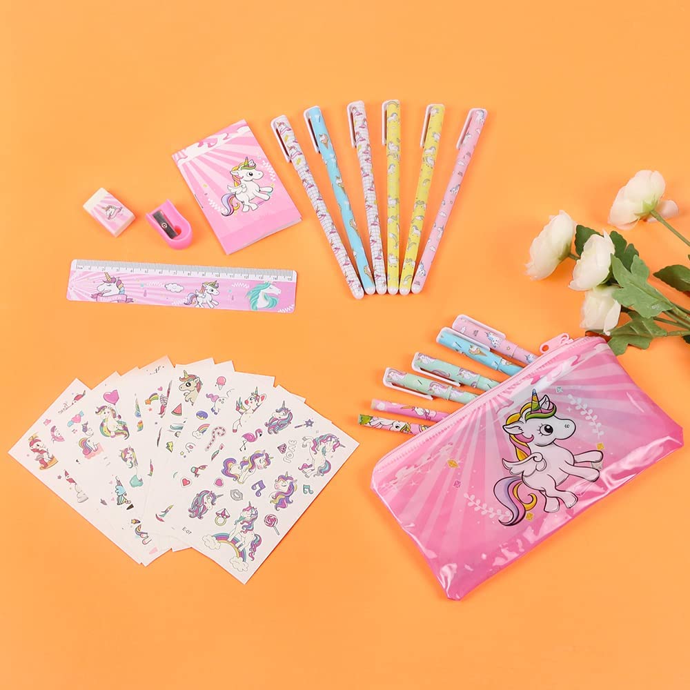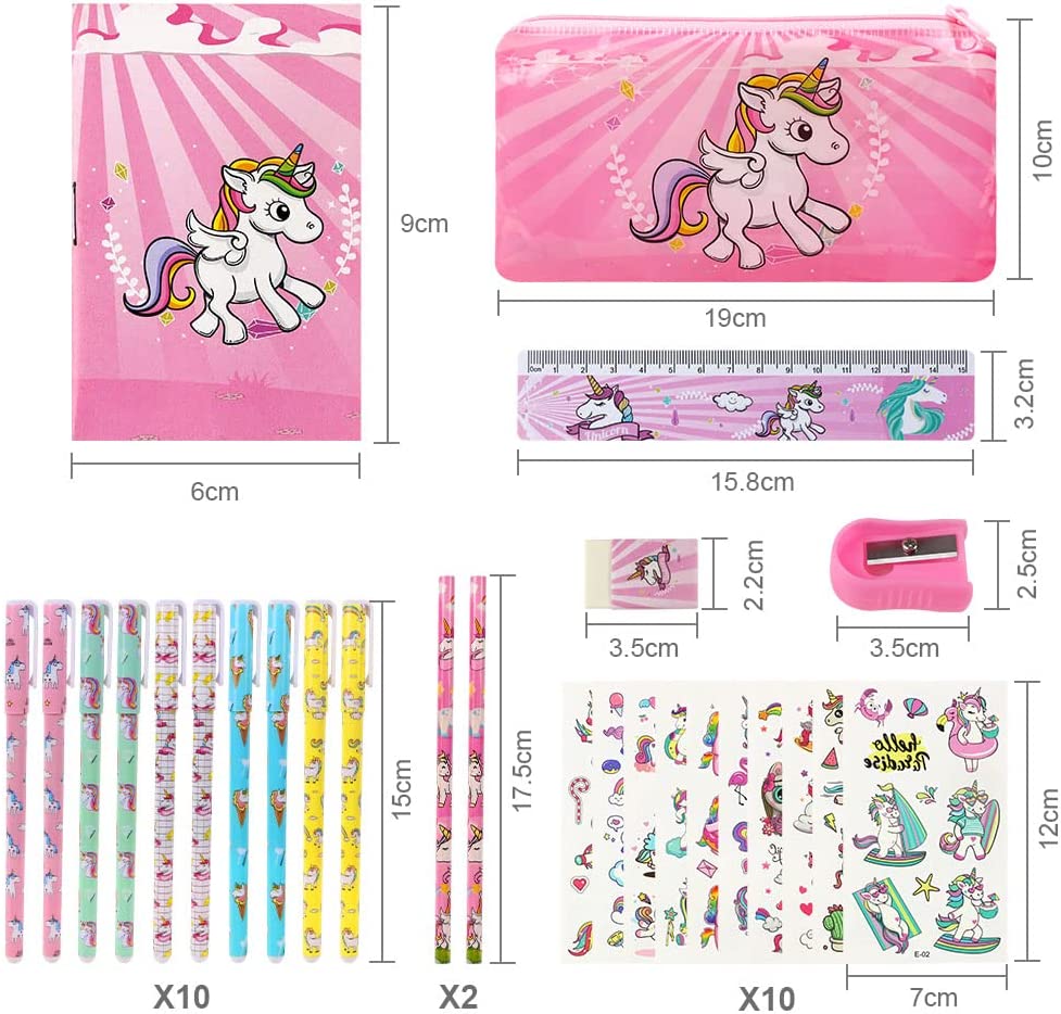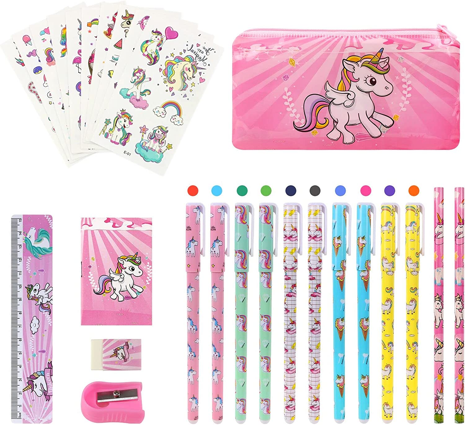 About this item Unicorn Stationery Set: Includes PVC plastic pencil case, 10 ink pens of different colors, 2 pencils, 1 sharpener, 1 eraser, 1 ruler, 1 note pad, 10 tattoo stickers (with each variety of cute unicorn patterns). 10 Colors Gel Pens: Gel pens have 10 colors and different unicorn designs on the pens, which are very popular with children. The size fits in the hand and can help with marking as well as drawing. Durable Pencil Case: The unicorn pencil case is made of waterproof PVC material with zipper, which is lightweight and portable. Large capacity, can hold a variety of school supplies, such as pencils, erasers, pencil sharpeners and more. Suitable for DIY: This unicorn set contains a variety of accessories that can capture children's attention and let their imaginations run wild. They can DIY their unique notebook or journal with colored pens and stickers on blank pages. Exquisite Gifts: Delicate unicorn set is the perfect gift for back to school, birthday, Christmas, New Years and any special day gift for girls 6 7 8 9 10 11 years old to stimulate their imagination and foster creative thinking .
